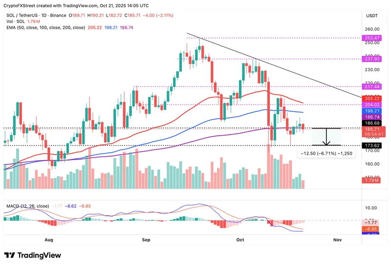 从技术面来看,Solana价格目前低于200日指数移动平均线(EMA),截至周二报186美元。根据日线图分析,当前阻力最小的路径仍然是下行。