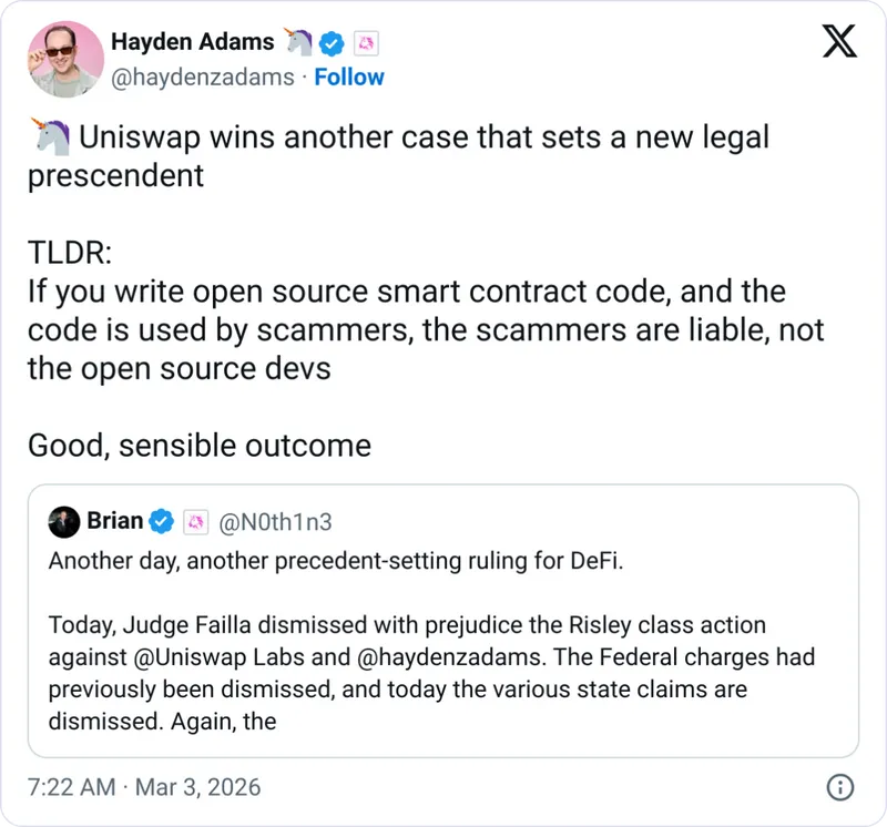 Uniswap的亚当斯在社交媒体上表示,这一裁决是一个“良好且明智的结果”,为未来的法律案例树立了新标杆。