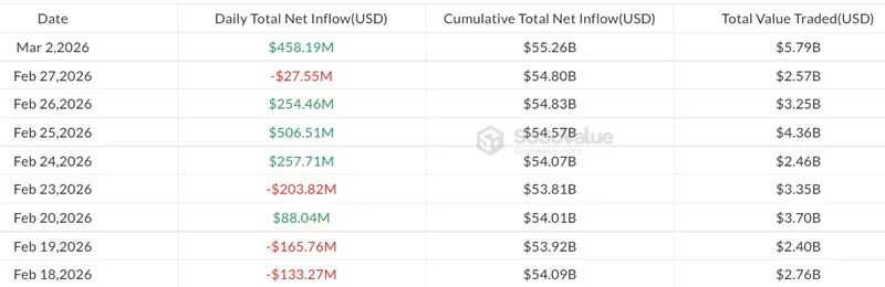 最新的资金流入使得累计净流入达到了553亿美元,交易量也上升至约58亿美元,创下自2月初以来的最高水平。