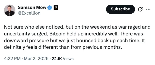 Jan3的首席执行官、比特币长期支持者Samson Mow周一在社交平台上表示,尽管周六伊朗遭袭的不确定性增加,但比特币在周末依然保持稳定。