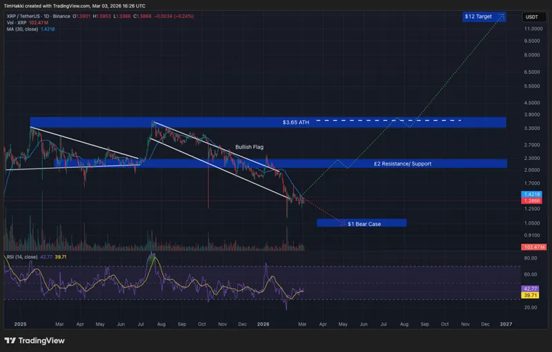 技术数据进一步支持了这一乐观预期。XRP的相对强弱指数(RSI)在43左右,价格走势在30日移动平均线附近获得支撑,表明长期的整固阶段可能已经结束。