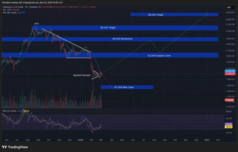 目前ETH的交易价格低于2,000美元,预计在5,000美元附近将面临重大阻力,正如去年8月的历史最高价4,946.05美元所示。