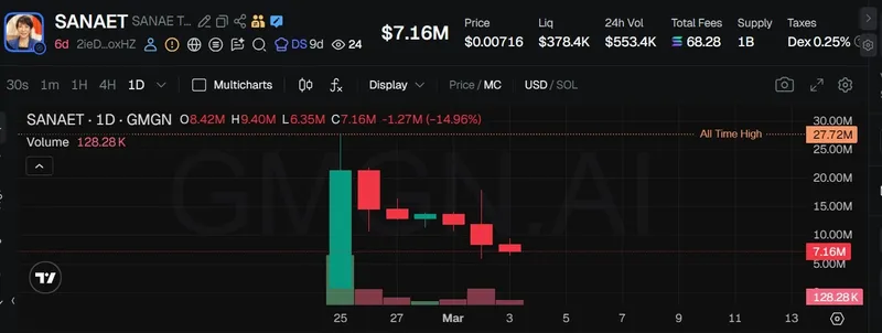根据加密数据追踪平台Gmgn的数据显示,该基于Solana的代币在2月25日市值一度达到2770万美元,但在高市早苗否认关联后,其价格和市值迅速下降。截至发稿时,该代币的市值约为700万美元。