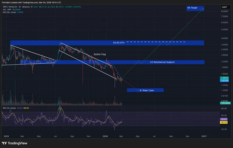 目前XRP的交易价格约为1.40美元,Claude的预测显示其可能在年底前上涨至8美元,意味着将从当前水平上涨六倍。