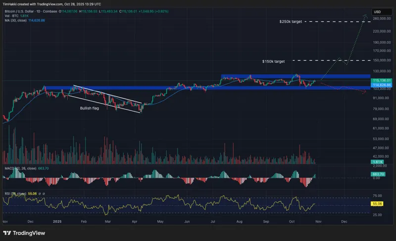 普通市场势头可能将比特币推升至150,000美元,但要实现Gemini设定的250,000美元目标,只有在牛市条件下,且美国监管机构能在圣诞节前推出全面的加密立法时,才有可能。