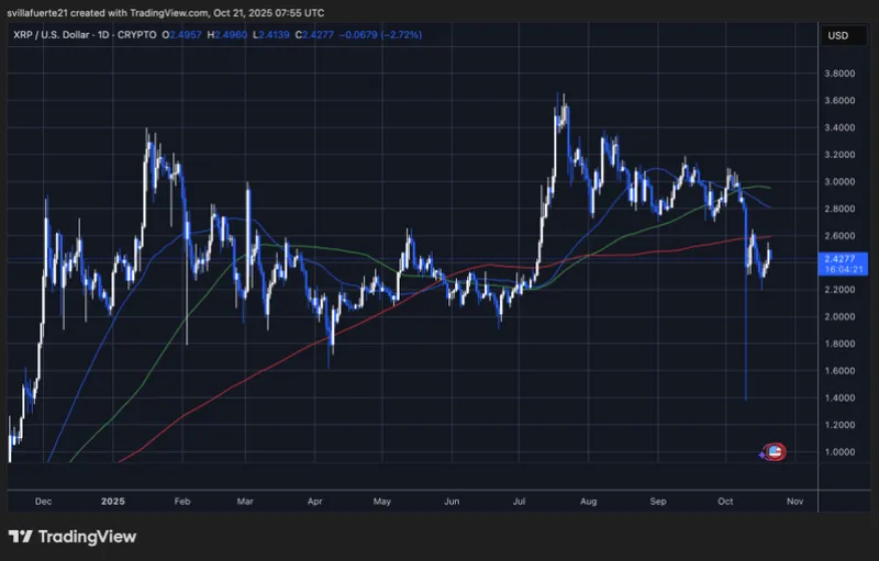 经历数周抛售后,XRP近期出现短暂企稳,截至撰稿时价格约为2.42美元。近期从2.30美元支撑位反弹,显示买方试图守住关键位置,但整体结构依然脆弱。当前价格低于50日和100日均线,暗示短中期趋势仍偏弱。