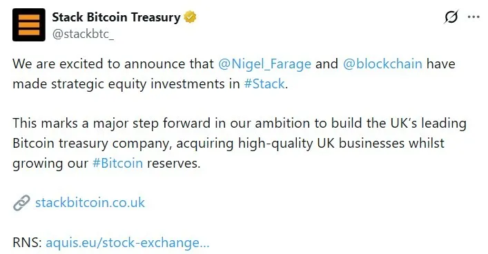 英国改革党党魁Nigel Farage通过其媒体平台Thorn In The Side向伦敦上市的比特币金库公司Stack BTC投资了21.5万英镑(约合28.6万美元),该公司由前英国财政大臣夸西·克沃滕担任主席。法拉奇此举旨在加深与加密行业的联系。