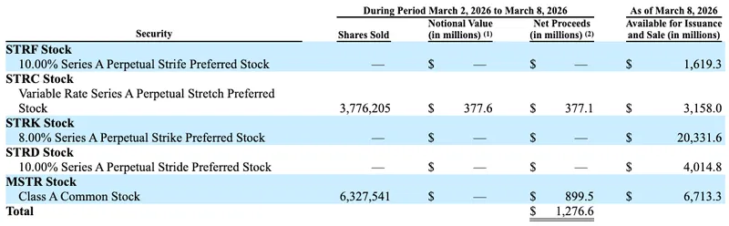 公司报告显示,其大规模购入13亿美元的比特币,创下公司历史上最大的一笔交易。普通股MSTR在已披露的销售中募集资金规模最大,接近9亿美元。