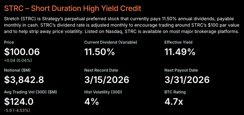 STRC是Strategy的浮动利率永久优先股,自2025年7月推出以来,成为公司支持比特币储备战略的多种证券之一,其他项目还包括Stride(STRD)、Strife(STRF)、Strike(STRK)及普通股(MSTR)。Strategy表示,该股票按月支付浮动现金分红,3月的年化分红率为11.5%。