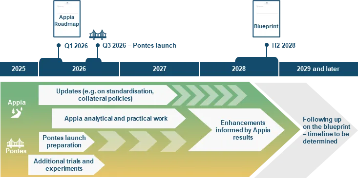 该路线图围绕两个主要项目展开:Pontes是欧元体系的分布式账本技术(DLT)结算方案,而Appia则是构建未来代币化金融生态系统的总体战略框架。欧洲央行表示,Pontes计划将在2026年第三季度正式推出。