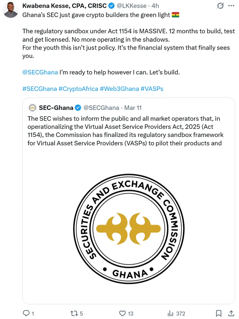 加纳证券交易委员会于周二宣布,已批准11家加密交易平台参与该国新设立的监管沙盒计划。这是自去年12月立法以来,支持加密行业的首个重要举措,旨在为本地市场提供监管清晰度。