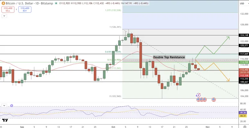 比特币(BTC/USD)目前交易价格接近112,400美元,回落自117,600美元的双顶阻力位,买方未能维持动能。日线图显示,比特币在短期下降通道内形成了低点,表明在上周的反弹后进入冷却阶段。