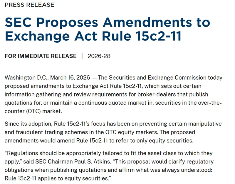 SEC在周一的声明中提议修订15c2-11号规则,限制场外券商的报告要求仅适用于“股权证券”,这将推翻2021年的解释。