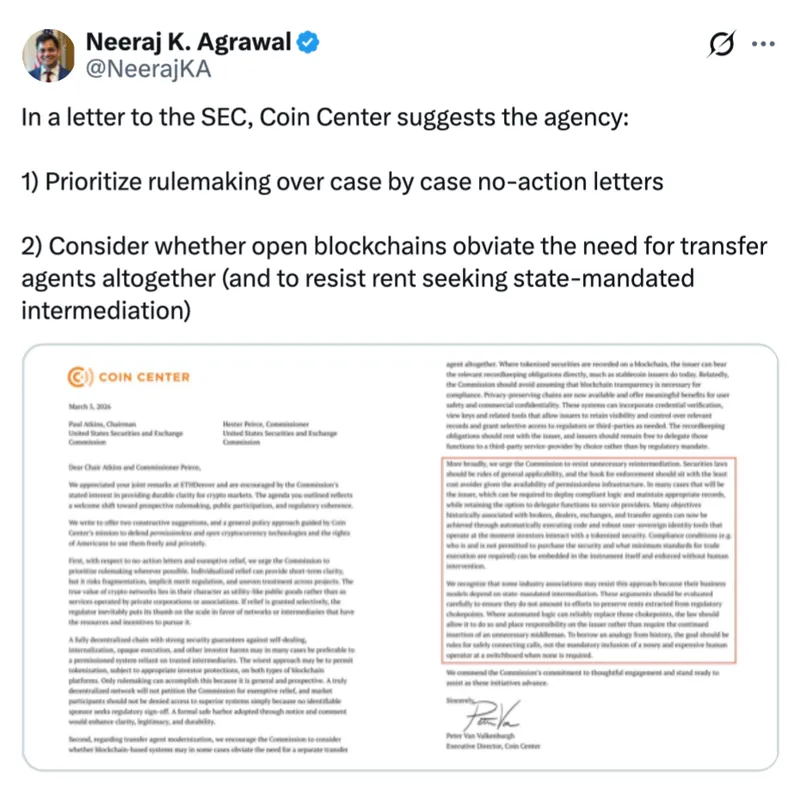 Coin Center在致SEC的信中表示,个别救济措施虽然能在短期内提供一定的明确性,但可能导致行业分化和不均等监管。该机构强调,监管机构应优先通过制定规则来解决相关问题。
