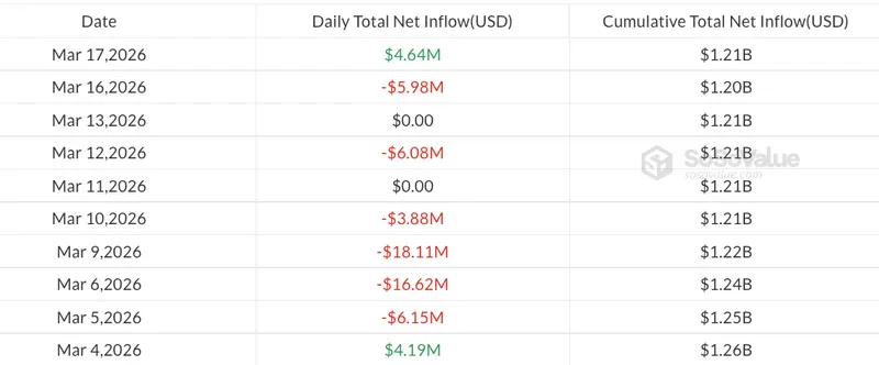 XRP表现突出,单日资金净流入464万美元,为3月4日以来的首次增长。在3月5日至16日期间,相关ETF累计流出5680万美元。