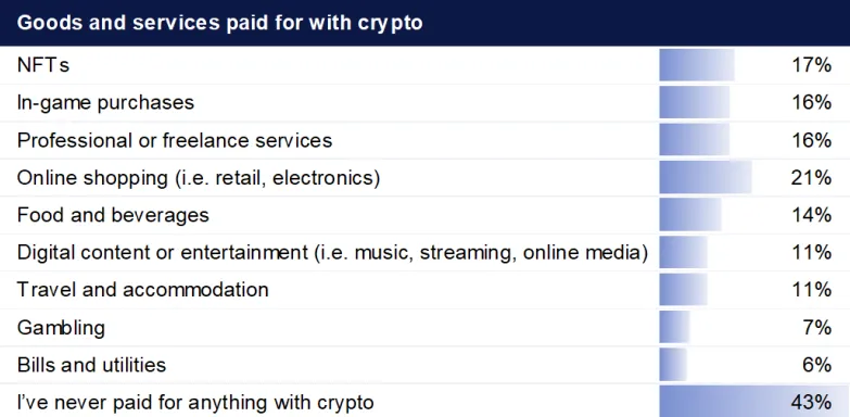 在用于商品和服务支付的受访者中,21%的人表示用加密货币进行网上购物,使其成为主要用途。