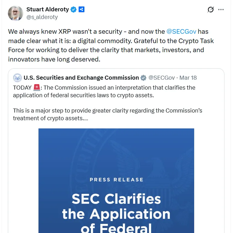 Ripple首席法务官Stuart Alderoty在X平台表示:“我们一直知道XRP不是证券,现在SEC已明确其属性为数字商品,感谢加密货币特别工作组为市场、投资者和创新者提供的清晰监管。”