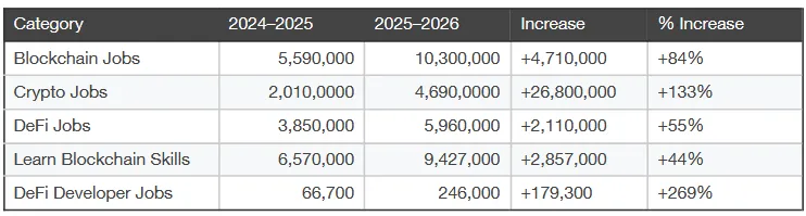 1Inch表示,这在谷歌搜索数据中也有所体现,数据显示2024年至2026年,“区块链职位”的谷歌搜索量增长了84%。