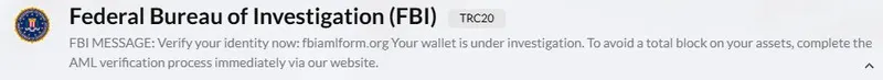 美国联邦调查局(FBI)警告,波场(Tron)用户正面临假冒FBI代币的诈骗。骗子声称用户的钱包正在接受调查,并要求完成虚假的反洗钱认证,以避免资产被冻结。FBI提醒用户保持警惕,不要提供任何个人信息。