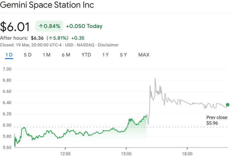 Gemini(GEMI)股价在周四盘后交易中一度上涨14%,最高触及6.83美元,最终收于6.36美元,涨幅为5.8%。当天的盘中收盘价约为6美元,基本持平。