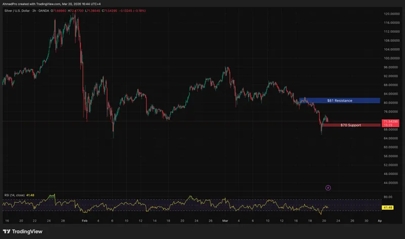 近期的市场波动十分剧烈。银价在3月18日曾飙升至80.17美元,随后在几天内暴跌至65.81美元。中东地区的地缘政治紧张局势暂时为银价提供了一定支撑,但整体趋势依然偏向空头。