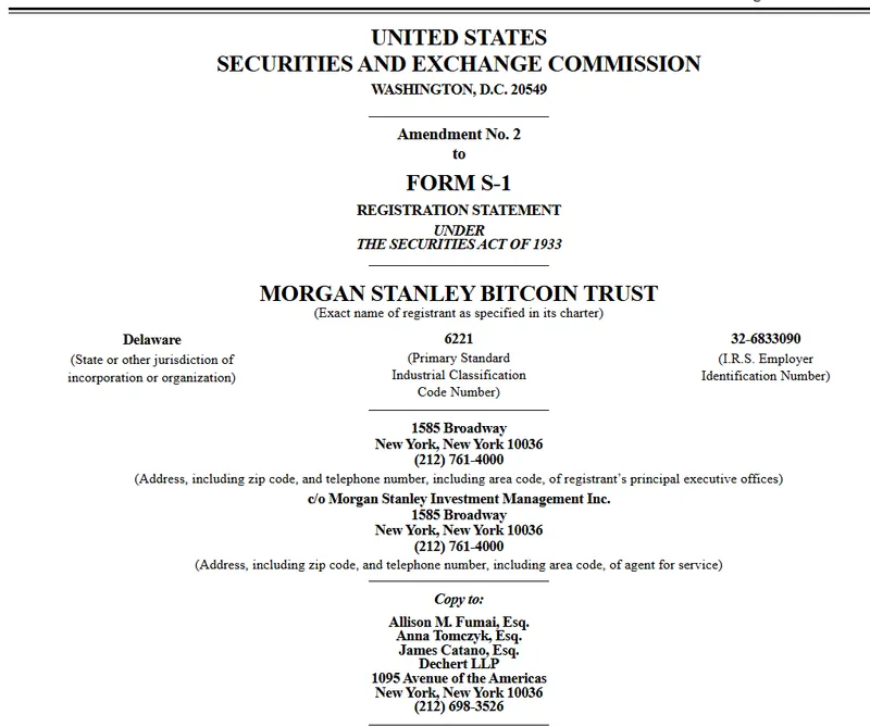 摩根士丹利为其拟议的现货比特币交易所交易基金(ETF)提交了第二份修订版S-1文件,详细披露了启动资金、交易伙伴以及上市计划,显示出这家华尔街银行正加快推出以MSBT为代码的产品。