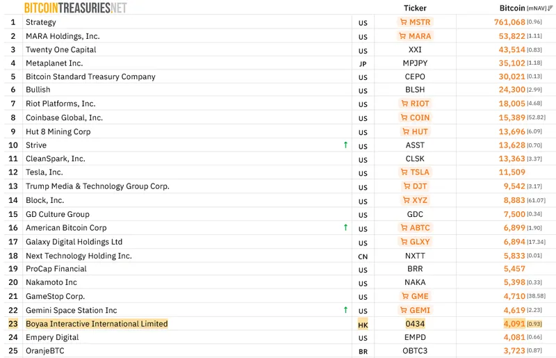 博雅互动国际是全球第23大比特币储备机构,同时在亚洲排名第三,仅次于日本的Metaplanet和中国的Next Technology Holding。