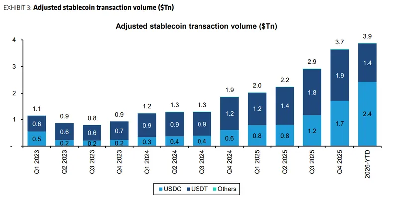 截至2026年,USDC已实现24万亿美元的调整后交易量,而Tether的USDt为14万亿美元。