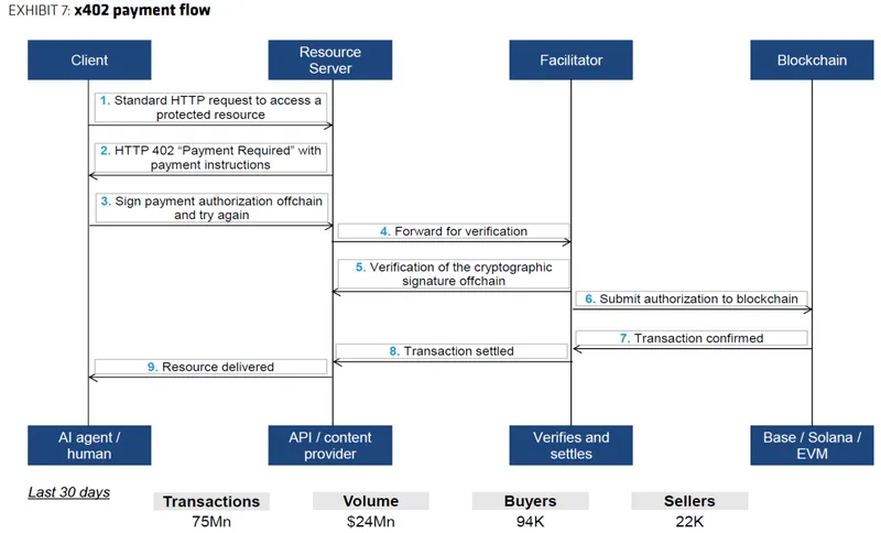 然而,Bernstein表示,目前该领域的进展仍然有限。报告指出,Stripe与Tempo的机器支付协议上线首周仅实现约5000美元的稳定币交易量,而Coinbase的x402协议过去30天的处理量也未超过2500万美元。