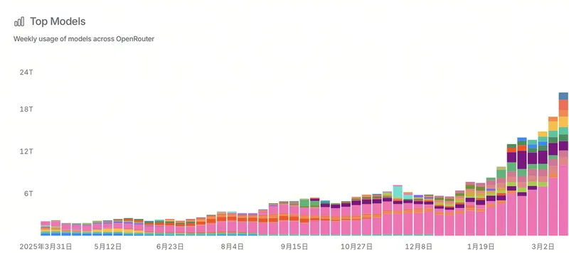Token经济的快速发展正面临着现实的挑战。根据全球最大AI模型API聚合平台OpenRouter的最新数据,全球Token消耗量正在以指数级增长。