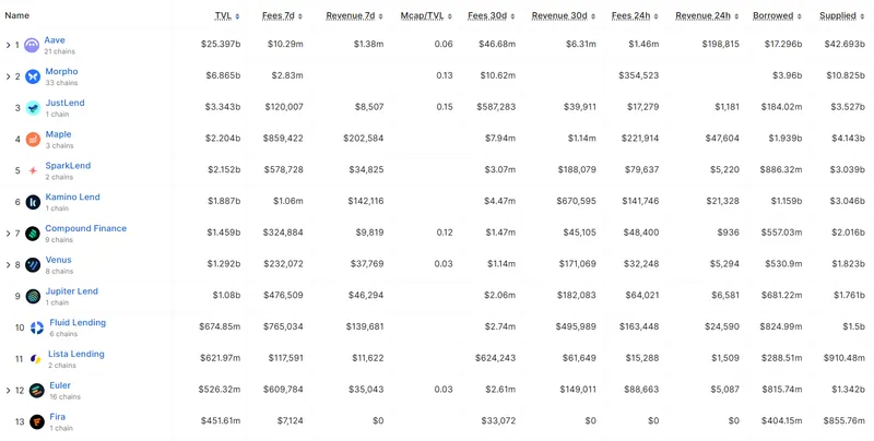 根据 DefiLlama 的最新数据显示,Fira 在以太坊上的总锁定价值约为 4.516 亿美元,而该领域的领先借贷协议 Aave 的 TVL 约为 253 亿美元。