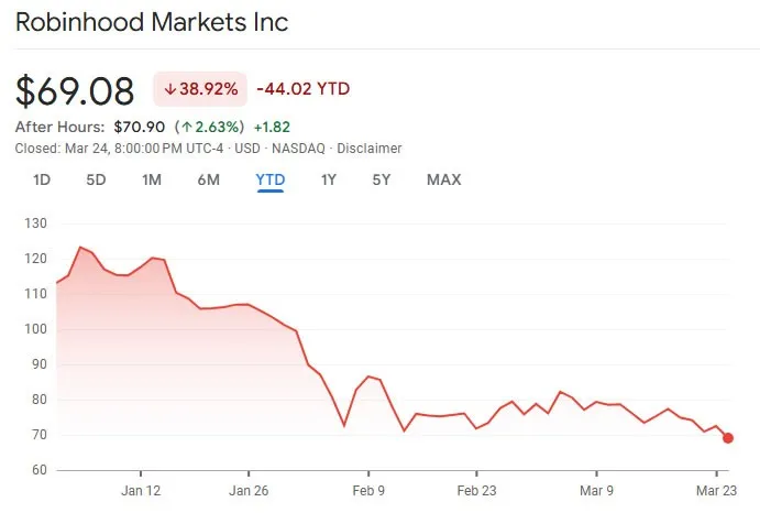 Robinhood股价在周二收盘时下跌4.7%,报69.08美元,创下今年以来的最低水平。盘后略有回升至70.90美元。