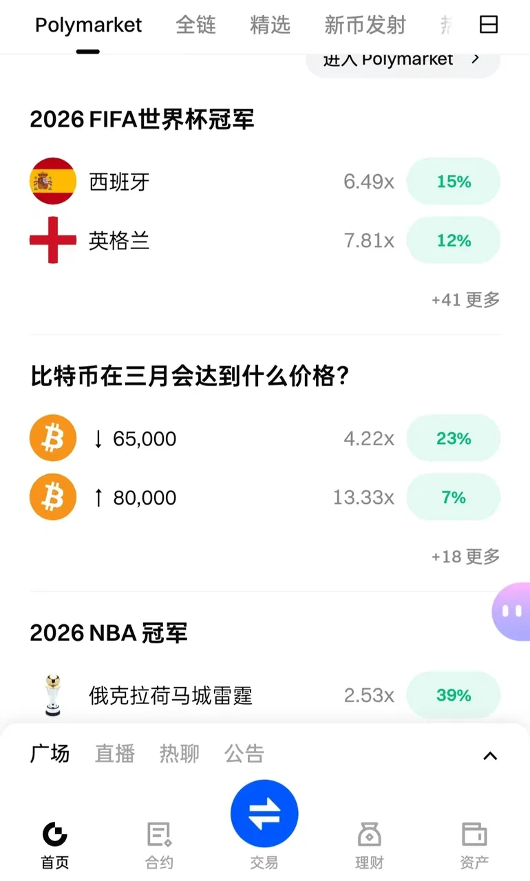 热门市场不再仅仅聚焦政治或单一财经事件,而是涵盖了BTC价格、ETH月内区间、黄金、美股市值排名、世界杯、NBA总冠军、欧冠、MVP等多个领域。它越来越像一个“现实世界热点价格面板”,而不是传统意义上的小众竞猜区。