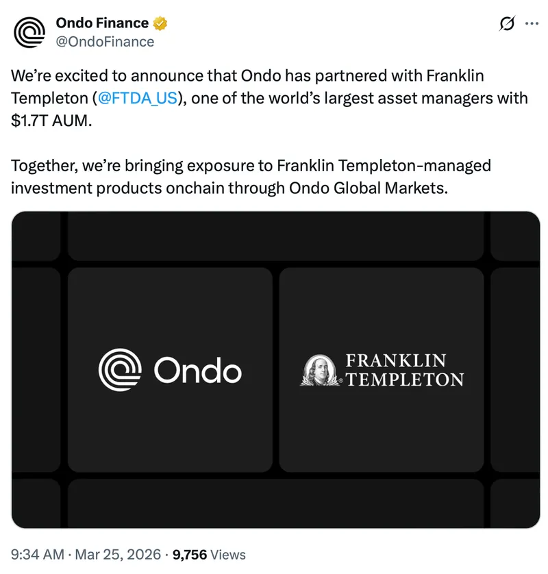 Ondo Finance与富兰克林邓普顿的这一举措正值代币化股票市场快速扩张之际。根据RWA.xyz的数据,市场总市值已从2025年初的约5亿美元增至2026年3月的约9.5亿美元。
