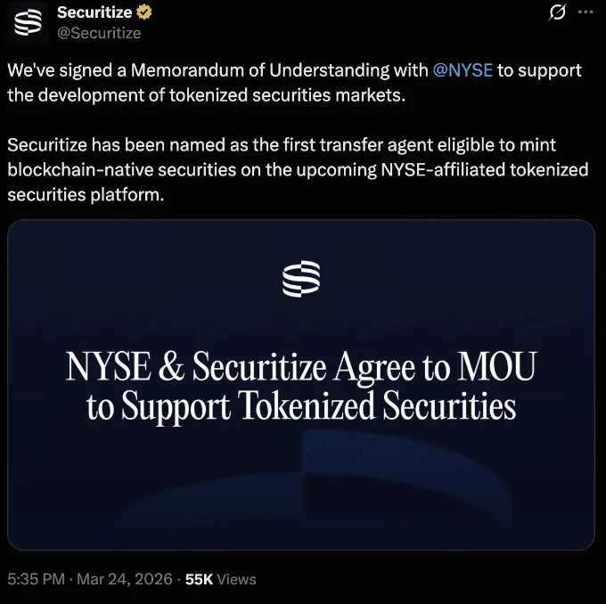 在市场消化这一信息的同时,3月24日,纽交所集团总裁林恩·马丁宣布与代币化平台Securitize签署战略合作备忘录。与纳斯达克的渐进式改良不同,纽交所选择了更为激进的路径,通过数字转让代理在区块链上铸造原生证券。