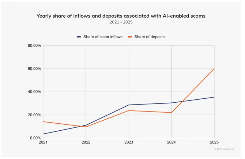 区块链分析公司Chainalysis的数据显示,约60%的诈骗钱包存款均由AI驱动的诈骗所引发,这一趋势自2021年以来持续增长。