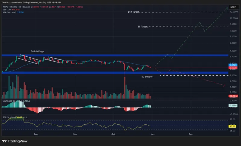 XRP的技术指标显示,2025年将出现多次看涨旗形的形态,暗示年底可能会有重大突破。