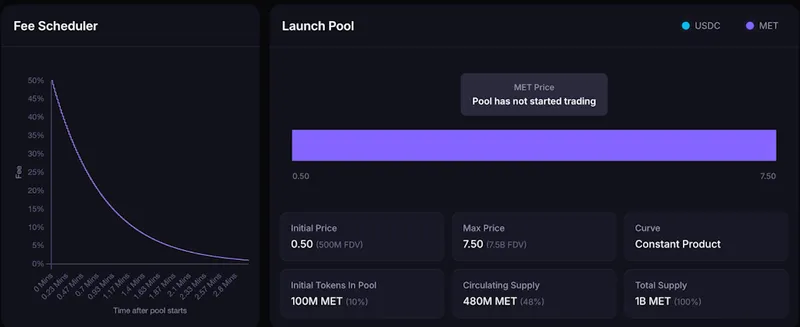 总供应量的 10%(1 亿 MET)将用于动态 AMM 池引导初始流动性,起始价格为 0.5 美元,对应 5 亿美元估值,流动性分布可达 75 亿美元。初期流动性池为单边 MET,早期买家以 USDC 兑换 MET。池费初始较高,后续将逐步下降。