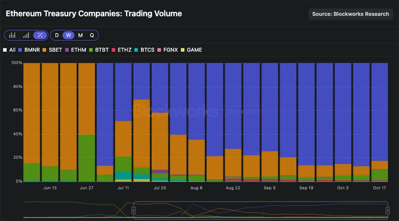 BMNR 在 ETH DATCO 的交易量中占据 60-85%,流动性最强。这种优势使其更受大型资金配置者青睐,同时也降低了 ATM 股票发行对价格的影响。BMNR 已成为 ETH DATCO 领域的主导者。