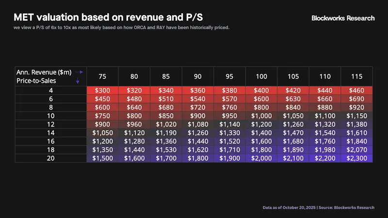 综合各项数据,MET 代币上市后合理市销率预计为 6 至 10 倍,对应流通市值在 4.5 亿至 11 亿美元区间。当估值超过 10 亿美元时,MET 相较于同类项目已偏高,若突破 20 亿美元则需显著提升收入以支撑估值。