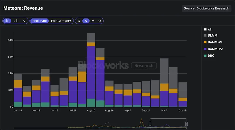 Meteora 过去 30 天内各池总收入达 880 万美元,链上活跃度较低时每周仍保持约 150 万美元。超过 90% 的收入来自 memecoin 池,费用等级高于其他池类型。