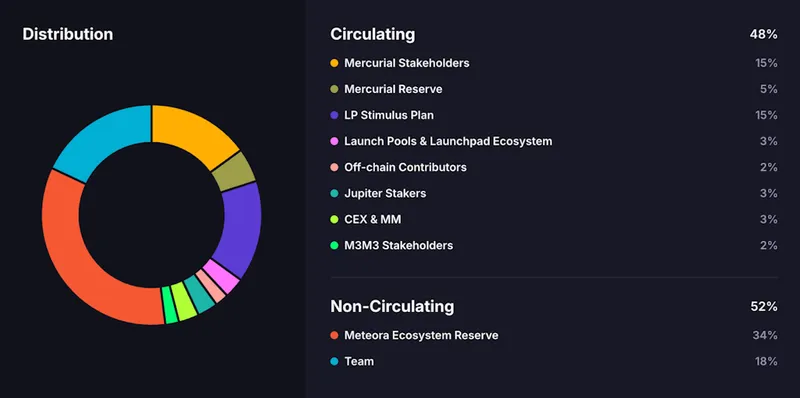Meteora 由 Solana 最大 DEX 聚合器 Jupiter 团队于 2023 年 2 月推出,前身为 Mercurial 金融。因 FTX/Alameda 持有大量 MER,团队决定以新代币 MET 重建平台。团队承诺将 20% 的 MET 分配给 Mercurial 持有者,实际分配为 15% 给持有者,5% 给受 FTX 影响的 Mercurial Reserve。此外,积分计划将分配 15% 的 MET。发行时,MET 的流通量为 48%,高于同类项目如 JTO、KMNO 或 JUP。