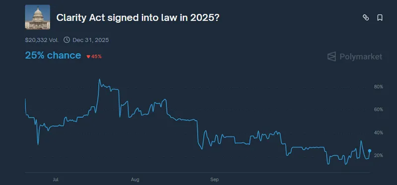 然而,预测市场的数据显示,Polymarket的数据显示,CLARITY法案在今年成为法律的机会仅为25%,相比于7月中旬的87%大幅下降。