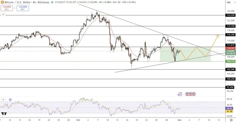 比特币价格预测保持中性,目前BTC交易价格约为110,089美元,日内上涨0.4%,价格在4小时图表上形成下行三角形模式。该结构由逐渐降低的高点和稳定的支撑位106,375美元构成,反映出市场正在整合,这一阶段通常预示着强劲的突破即将到来。