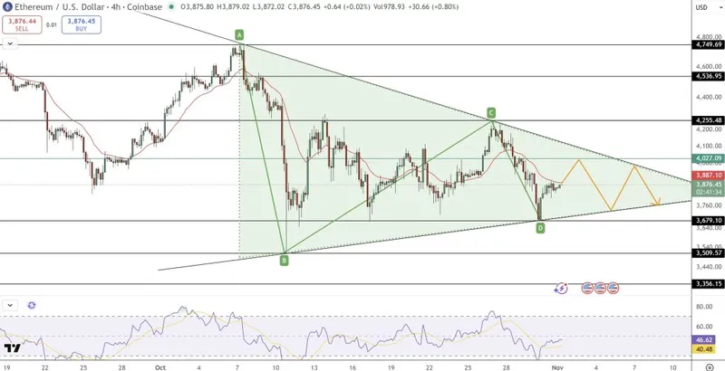 在欧洲交易时段,以太坊(ETH)价格接近3,802美元,略有上涨,市场参与者正在评估下一步是突破还是回调。以太坊的市值为4677亿美元,仍然是第二大加密货币,但其价格走势在自十月中旬以来形成的对称三角形模式中显得相当紧缩。