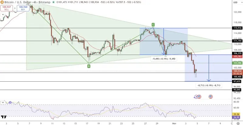 比特币价格预测呈现看空趋势,当前交易价格接近101,300美元,自9月中旬以来的对称三角形突破后,延续了下行趋势。