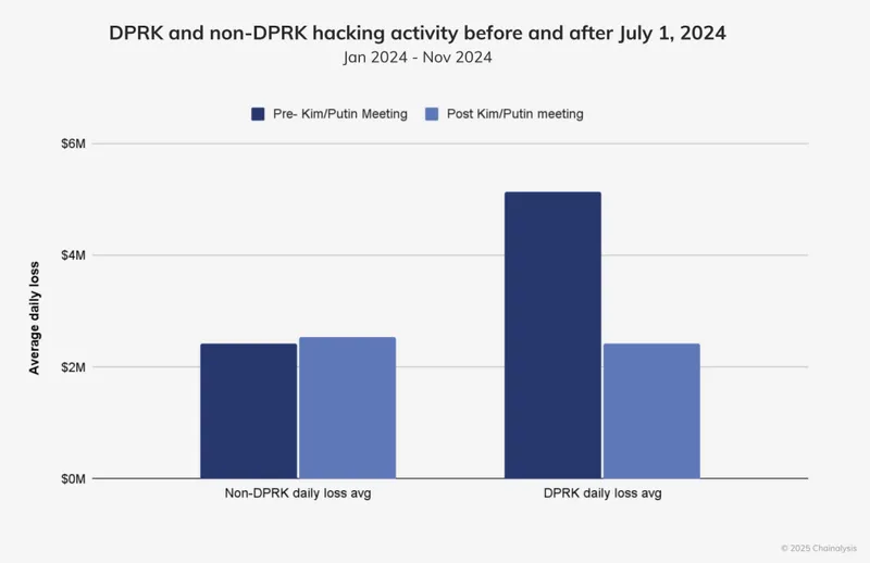 根据区块链分析公司Chainalysis的数据,尽管在年初攻击事件激增,但与朝鲜网络行为者相关的非法活动在2024年7月1日后显著减少。