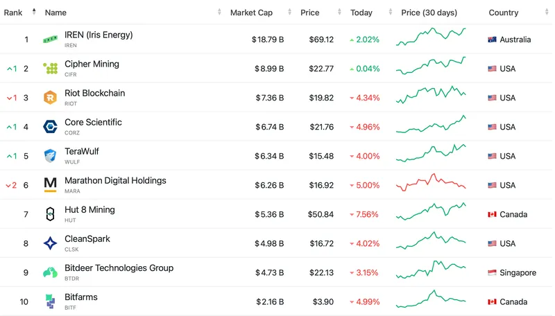 自2021年中国禁止BTC挖矿以来,该行业的大部分算力已迁移至美国,目前美国约占全球BTC算力的37%,成为最大的单一挖矿中心。在全球十大上市矿业公司中,有六家总部位于美国。