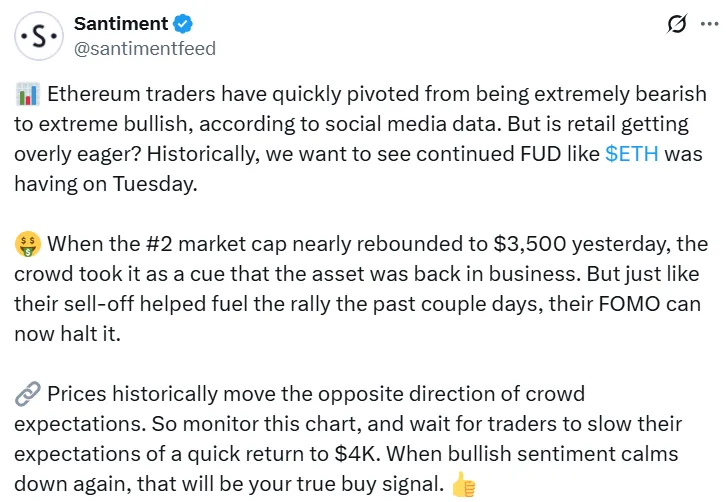 Santiment表示:“以太坊交易者迅速从极度看跌转向极度看涨,当ETH几乎反弹至3500美元时,群众将其视为该资产恢复的信号。”