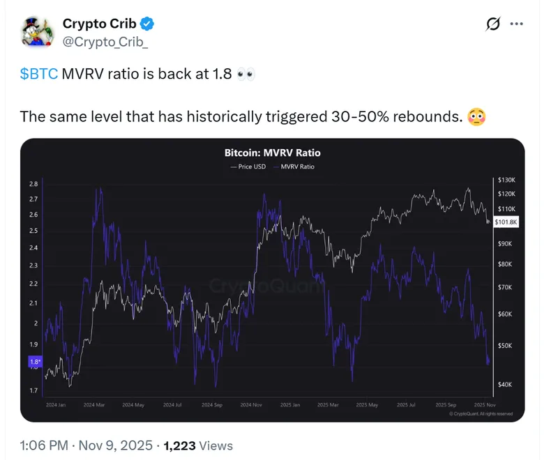 与此同时,链上数据似乎支持比特币的潜在反转。市场分析平台Crypto Crib指出,比特币的市场价值与已实现价值比率(MVRV)已回到1.8,这一水平在历史上曾先于30-50%的反弹。